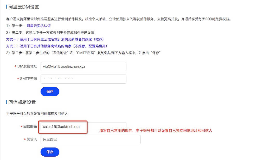 4.回到My Alibaba-客戶管理-edm配置,把發(fā)信地址和密碼粘貼進去,并立即保存。不保存無法配置回信郵箱